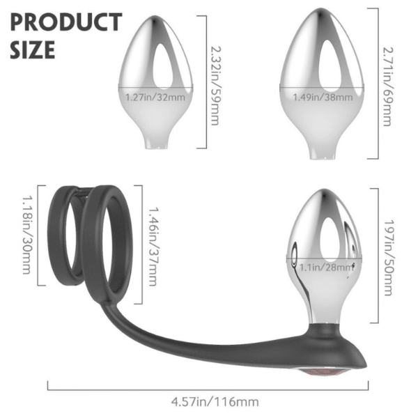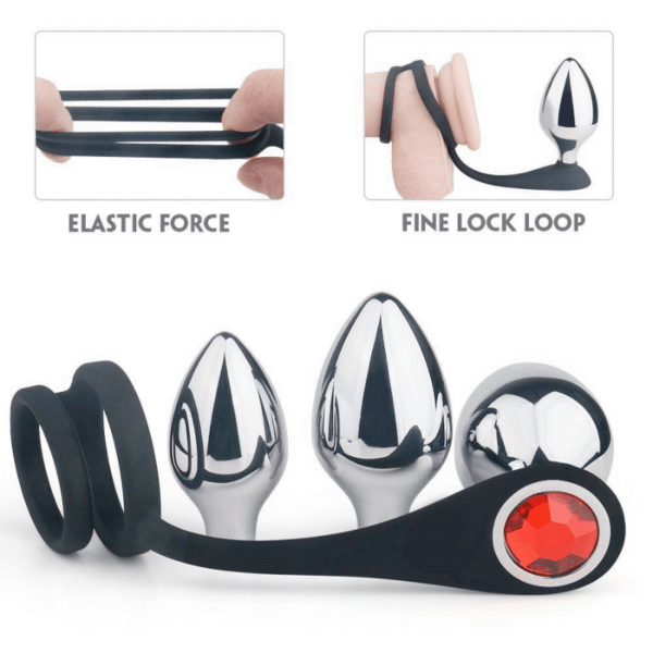 • Cock Ring & Butt Plugs Combined: As for a penis ring, one ring wraps around the base of your erection to keep you harder, longer; the second ring circles the scrotum to deliver ball-tugging sensation with every move. The stainless steel weighted butt plug to drive you crazy, all the same time!