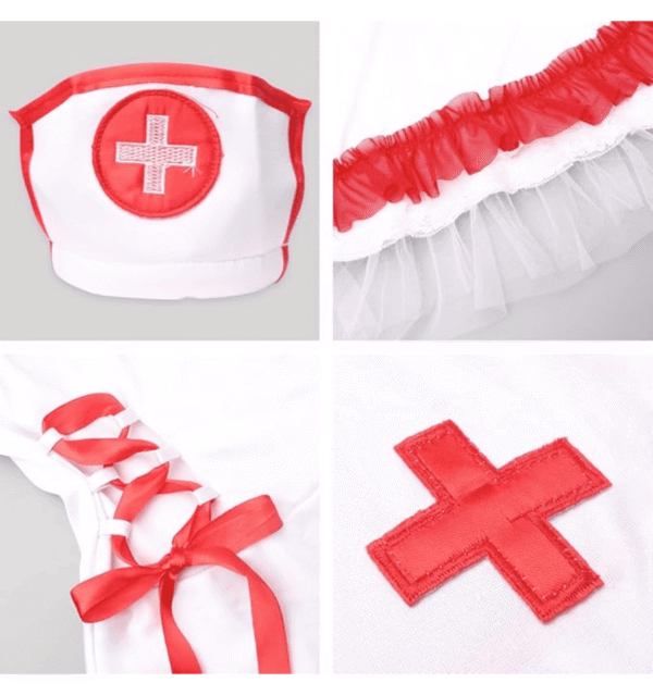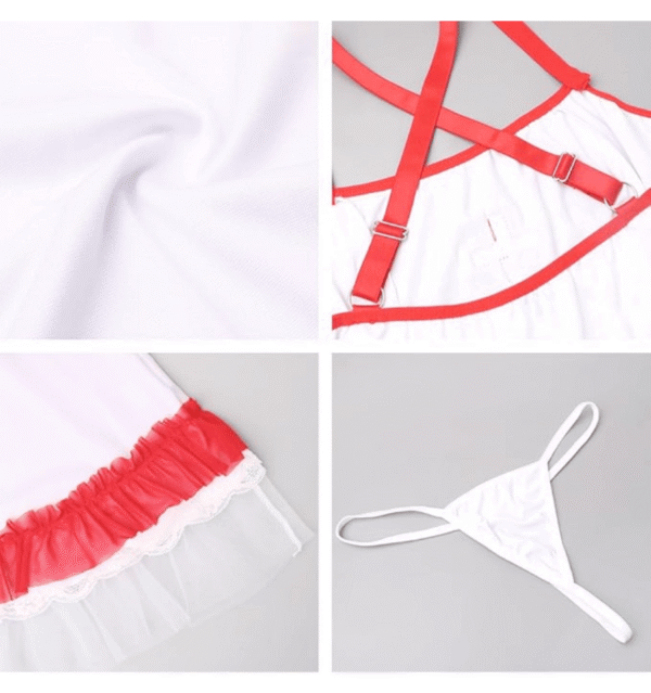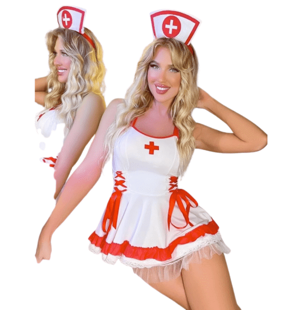 Minimalist reveal: Wear the Seductive Three-Piece Nurse Set with sheer thigh-highs and clean heels. Let the red/white contrast supply the impact while the silhouette stays streamlined.