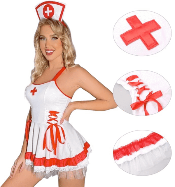 The Seductive Three-Piece Nurse Set is intended strictly for consenting adults. If you prefer additional coverage, pair with seamless pasties or a minimal thong that respects the garment’s lines. Test jewelry and accessories for snag risk before dressing. Allow skin to breathe between long sessions, and always follow the care instructions for hygiene and textile longevity.
