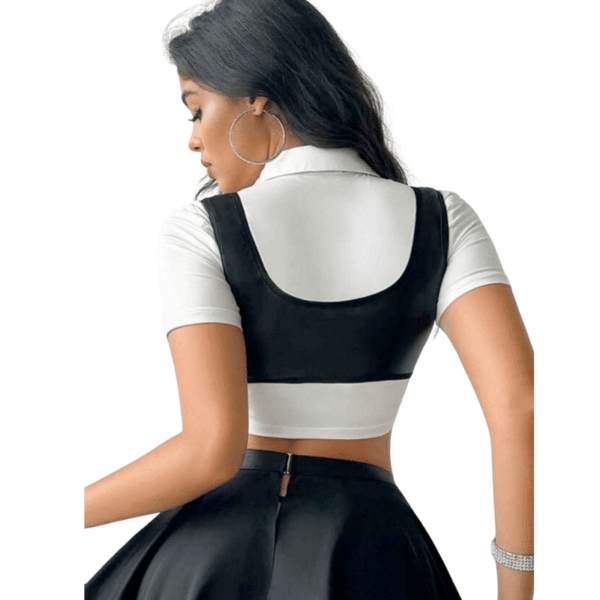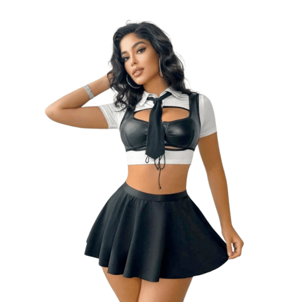 The black-and-white palette is more than aesthetic—it provides visual sculpting. Dark panels recede while light panels draw the eye, creating balance and definition across the torso and hips. The skirt length is set to elongate the leg line without sacrificing coverage, and the top’s proportions frame the shoulders and bust cleanly. Together, these choices yield a cohesive, adult roleplay look that remains tasteful and composed.