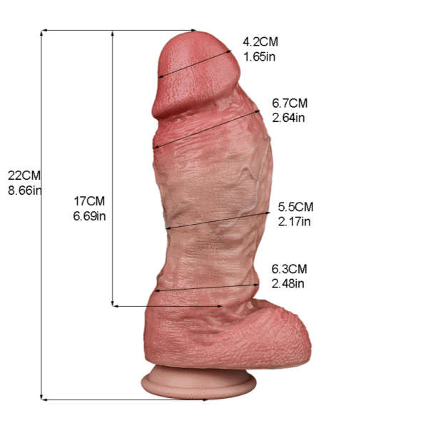 — Material: ultra-realistic double-layer silicone (soft outer skin over a supportive core), body-safe and non-porous | Color: skin tone | Size: 8.66 in × 2.64 in (22 cm × 6.7 cm) | Net Weight: 28.5 oz / 1.78 lb (807 g) | Design: swollen head, prominent veins, rounded base for secure grip | Lubricant Compatibility: water-based only. Engineered for lifelike fullness, The Swollen Double Layer Dildo blends a supple, “fleshlike” exterior with a steady inner core so each stroke feels cushioned yet controlled. The generous diameter of 2.64 inches (6.7 cm) delivers a true stretch, while the contoured glans and swollen shaft amplify contact on every millimeter of movement. With a satin-matte, non-porous surface that cleans to a hygienic finish, The Swollen Double Layer Dildo stands out as a serious, high-performance choice for users who want authentic weight, realistic texture, and long-term durability.